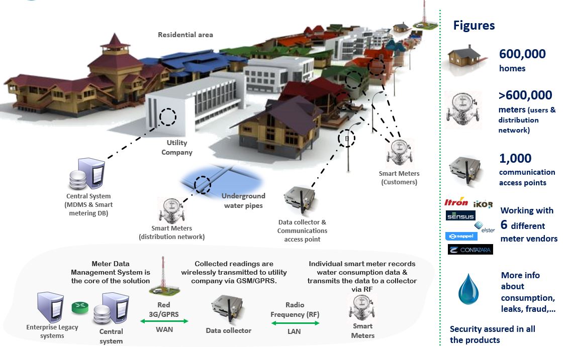 Sistema Meter Data Management para la gestión de la red de contadores ingeligentes de una empresa distribuidora de agua. La solución permite acceder a las lecturas de agua en los puntos de consumo de los clientes y en puntos intermedios de la red, de manera remota y en tiempo real, de cara a obtener mayor información sobre el consumo y detectar fugas y fraudes en la red.