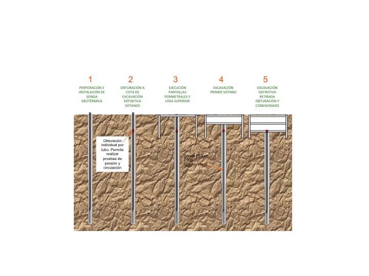 Conclusiones: para la implantación de sistemas geotérmicos en edificios en rehabilitación o en construcción descendente, donde por motivos de bajo gálibo y/o accesos reducidos, las perforaciones sólo se pueden realizar a cota 0 (nivel calle), o bien cuando el desarrollo de la rampa de acceso a cota último sótano no permita la ejecución de la totalidad del campo de captación de proyecto, es de aplicación la solución de obturación forzada en los sondeos, que permite garantizar la estanqueidad de las sondas durante todas las fases constructivas del proyecto.
