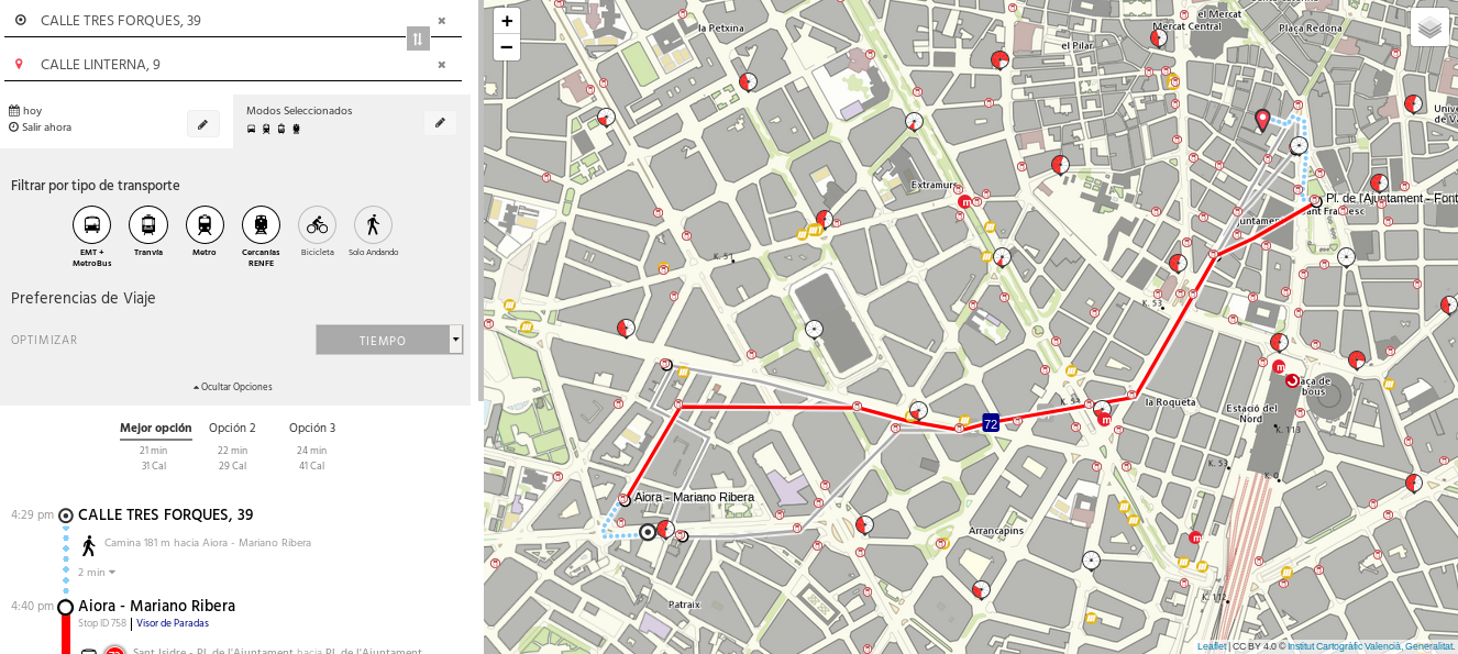 Cálculo de rutas multimodal (autobus, metro, bicicleta, bike sharing,...). Promoción de la movilidad sostenible.